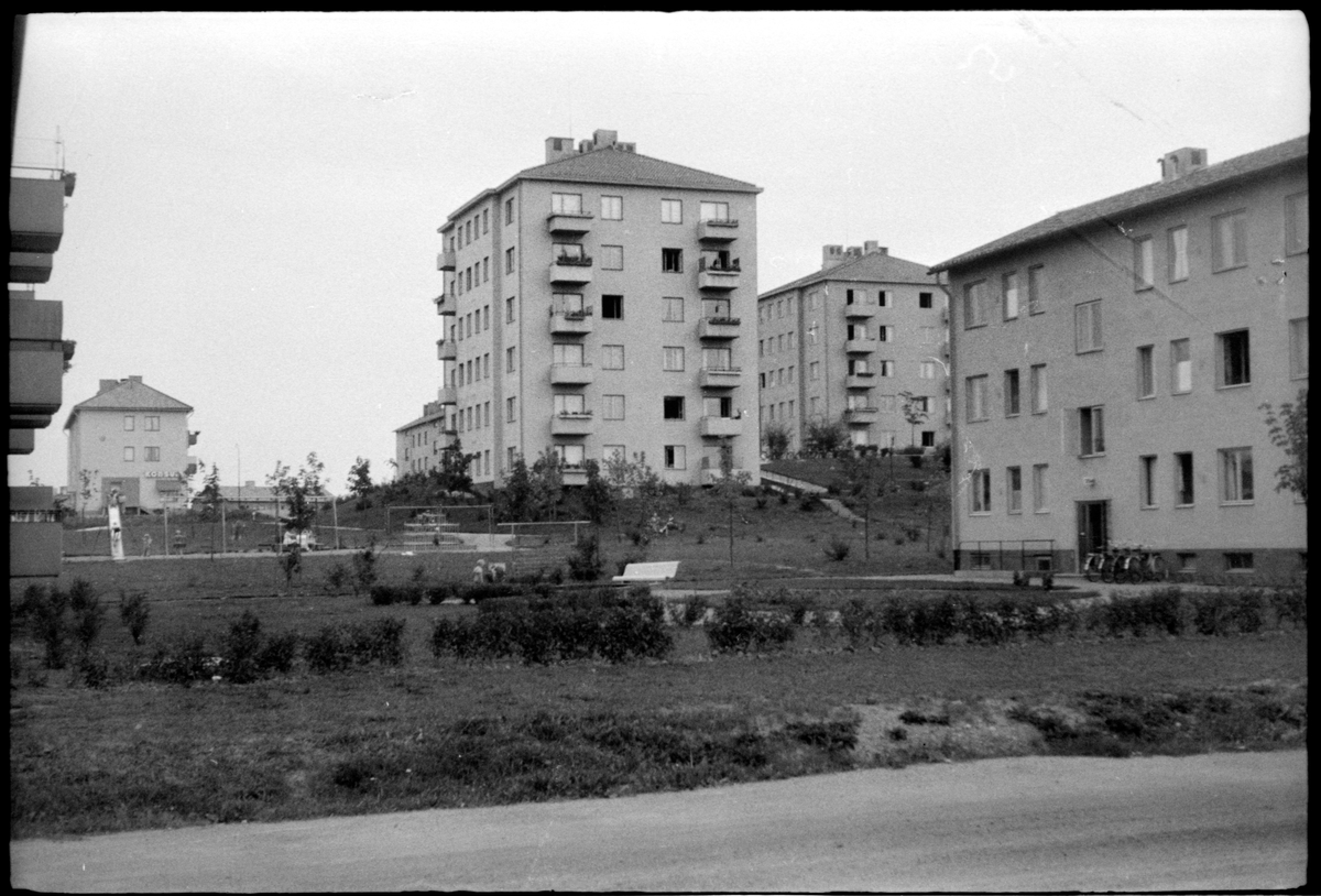 Bostadsområde med lekpark i Linköping. Bilden troligen tagen från Nya Tanneforsvägen i riktning mot Kungsberget.