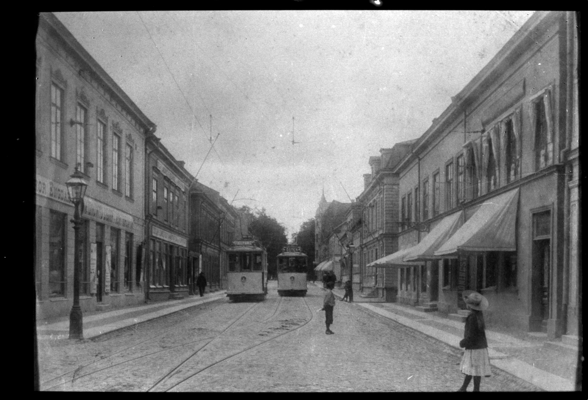 Jönköpings Spårvägar, JS spårvagnar i trafik vid mötesspåret på Västra Storgatan. Vagnen till höger i bild går till Öster och den vänstra till stadsparken i Jönköping.