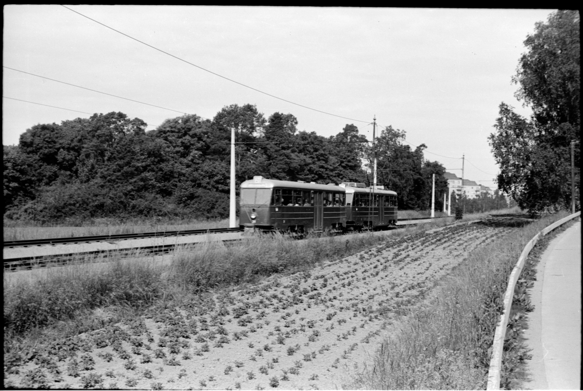 Spårvagns tåg på Linjen Bodal - AGA sedd mot Bodal på Trafik Aktiebolaget Stockholm Södra Lidingöns Järnväg, SSLidJ.