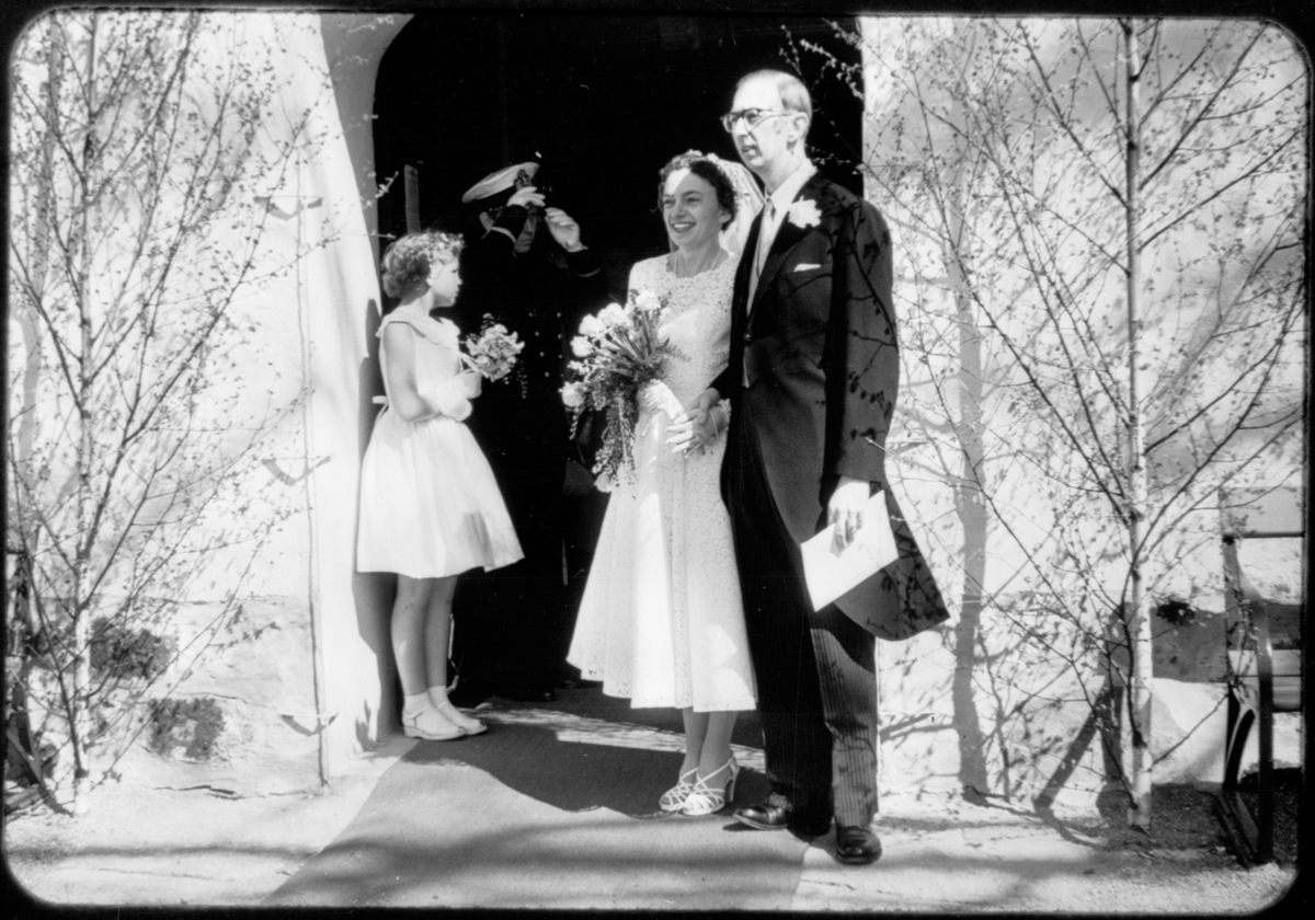Titel: Nygifta brudparet Lennart och Ulla Welander utanför Lidingö kyrka.