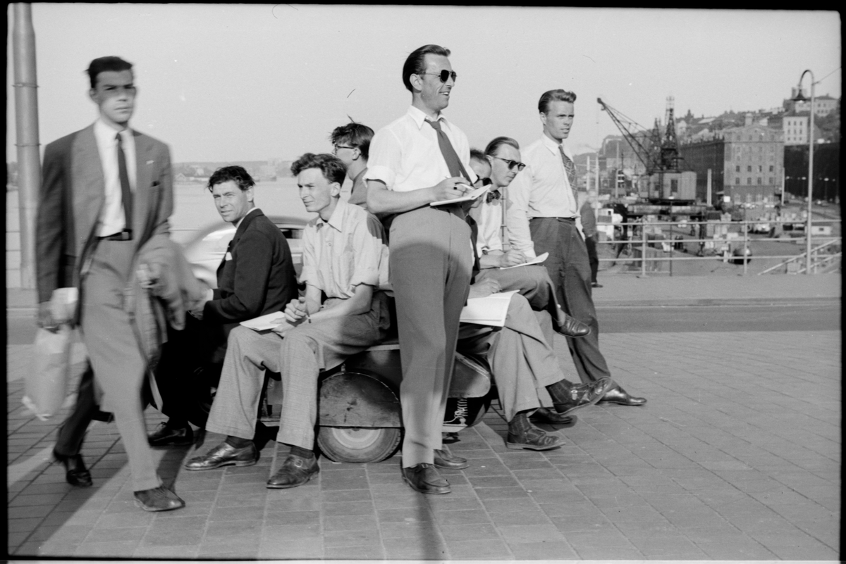 På bron vid Västra Stadsgårdshamnen sitter: andra från höger i bild, Lennart Welander. Bredvid kranarna ses Magasinbyggnaden "Maggan".