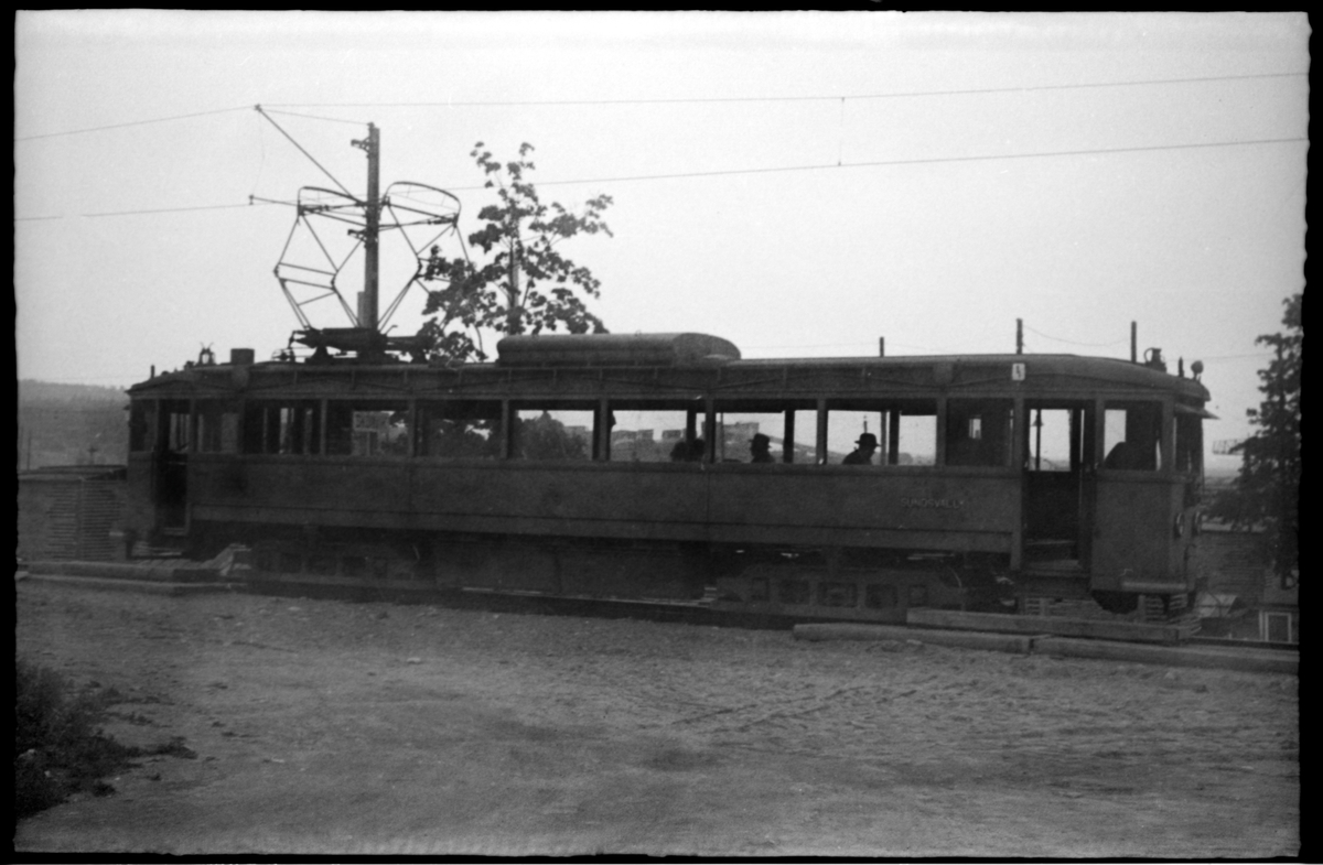 Spårvagn tillhörande Spårvagnsaktiebolaget Sundsvall - Skönvik, SSS står på spåret i Skönvik.