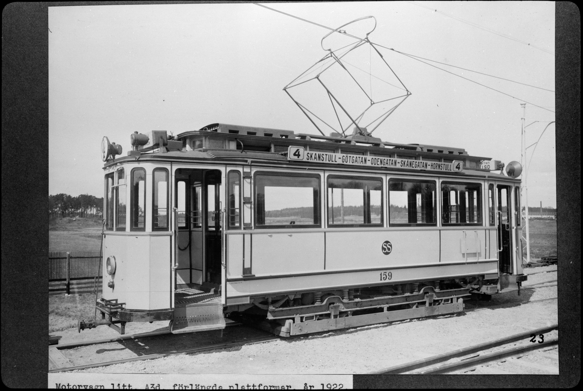 Aktiebolaget Stockholms Spårvägar, SS A3d 159. Den trafikerade linje 4 mellan Skanstull och Hornstull. Fotograferad vid Hagalund järnvägsstation.