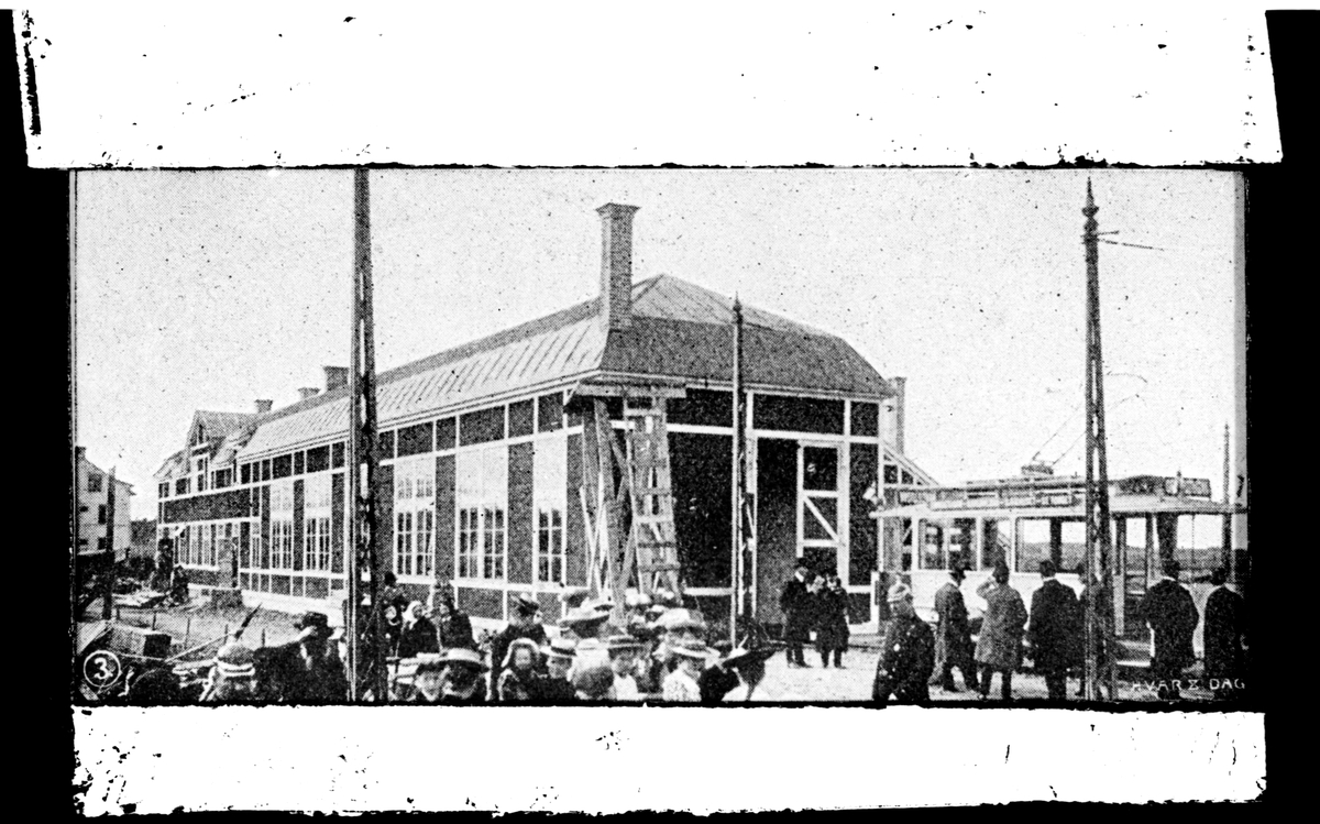 Titel: Folksamling vid vagnshall och kontorsbyggnad i Uppsala.