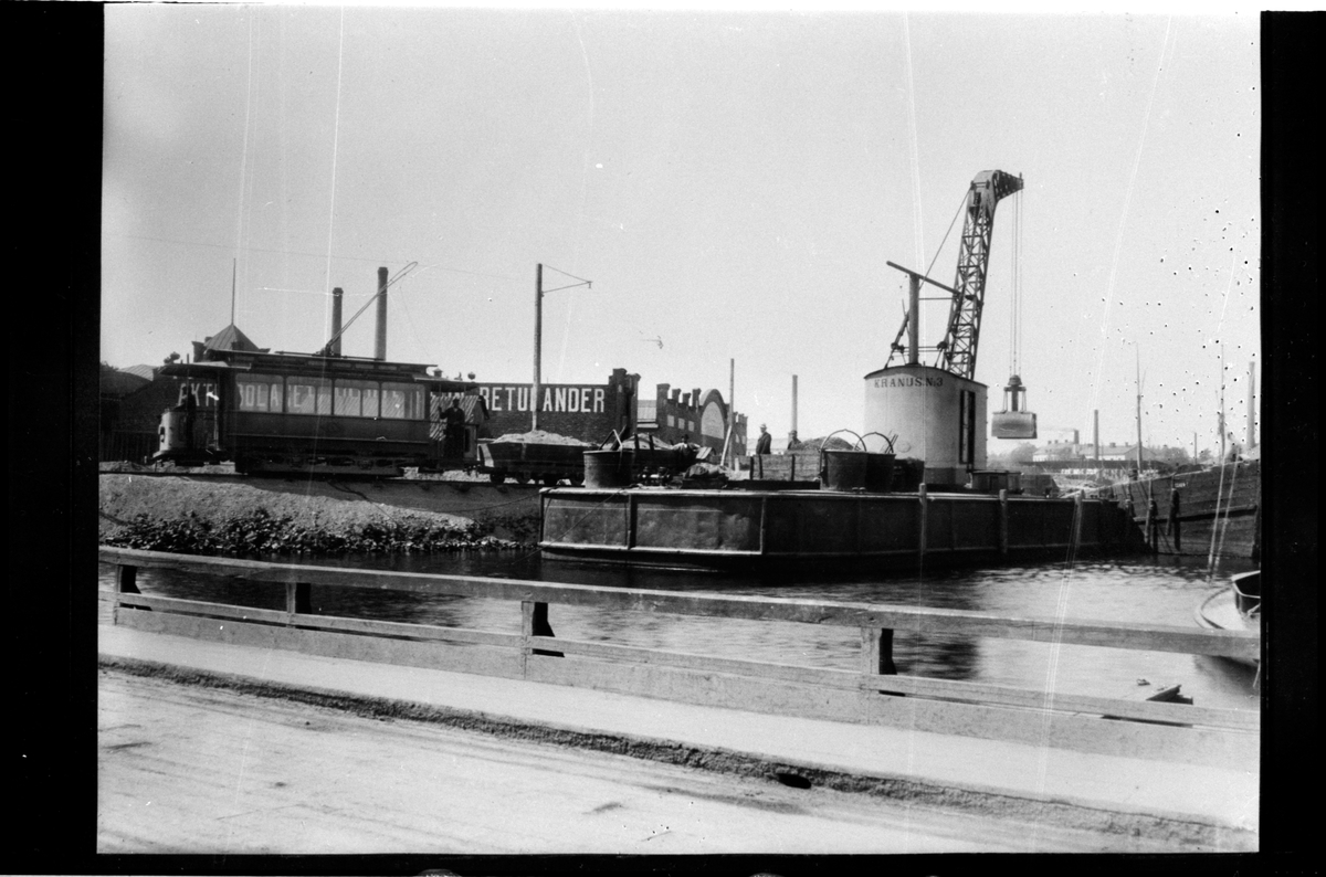 Spårvagn med godsvagn framför AB Autotelefon Betulander vid Liljeholmens hamn, Stockholm.