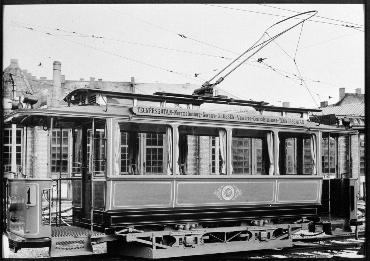 Leveransbild på Stockholms Nya Spårvägsaktiebolag, SNS A2 102. Bilden är tagen på bangård utanför spårvagnshall.