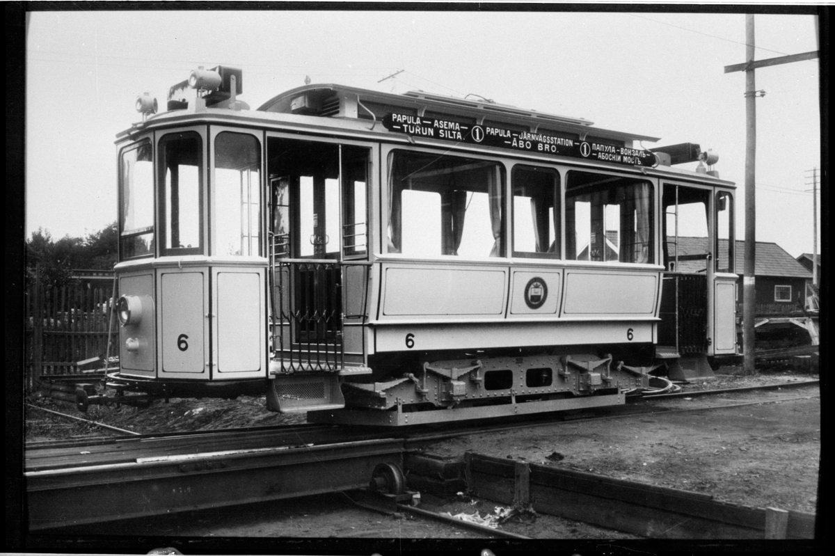 Leveransbild på Viipurin Kaupungin Sähkölaitos, VKS spårvagn 6. Bilden är tagen då Viborg fortfarande tillhörde Finland.