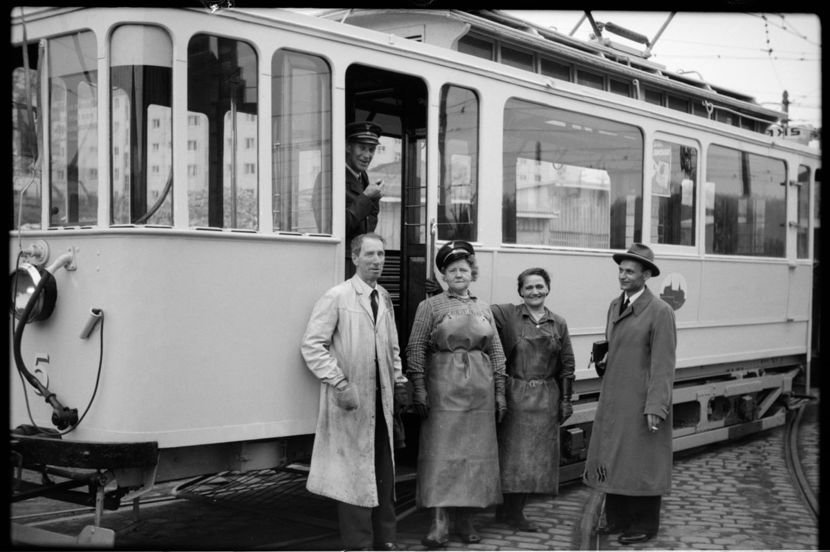 Aktieselskabet Oslo Sporveier, OS spårvagn 5 med personal i och utanför vagnen.