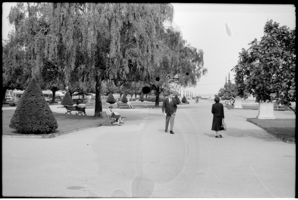 Vy över Genèvesjön från Quai du Mont-Blanc en park i Genève.