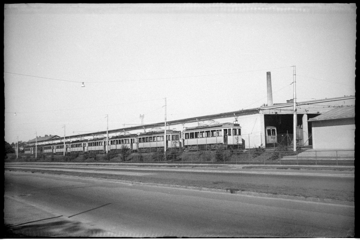 Spårvagnar tillhörande Stockholms Spårvägar, SS, står på spåret utanför en vagnhall.