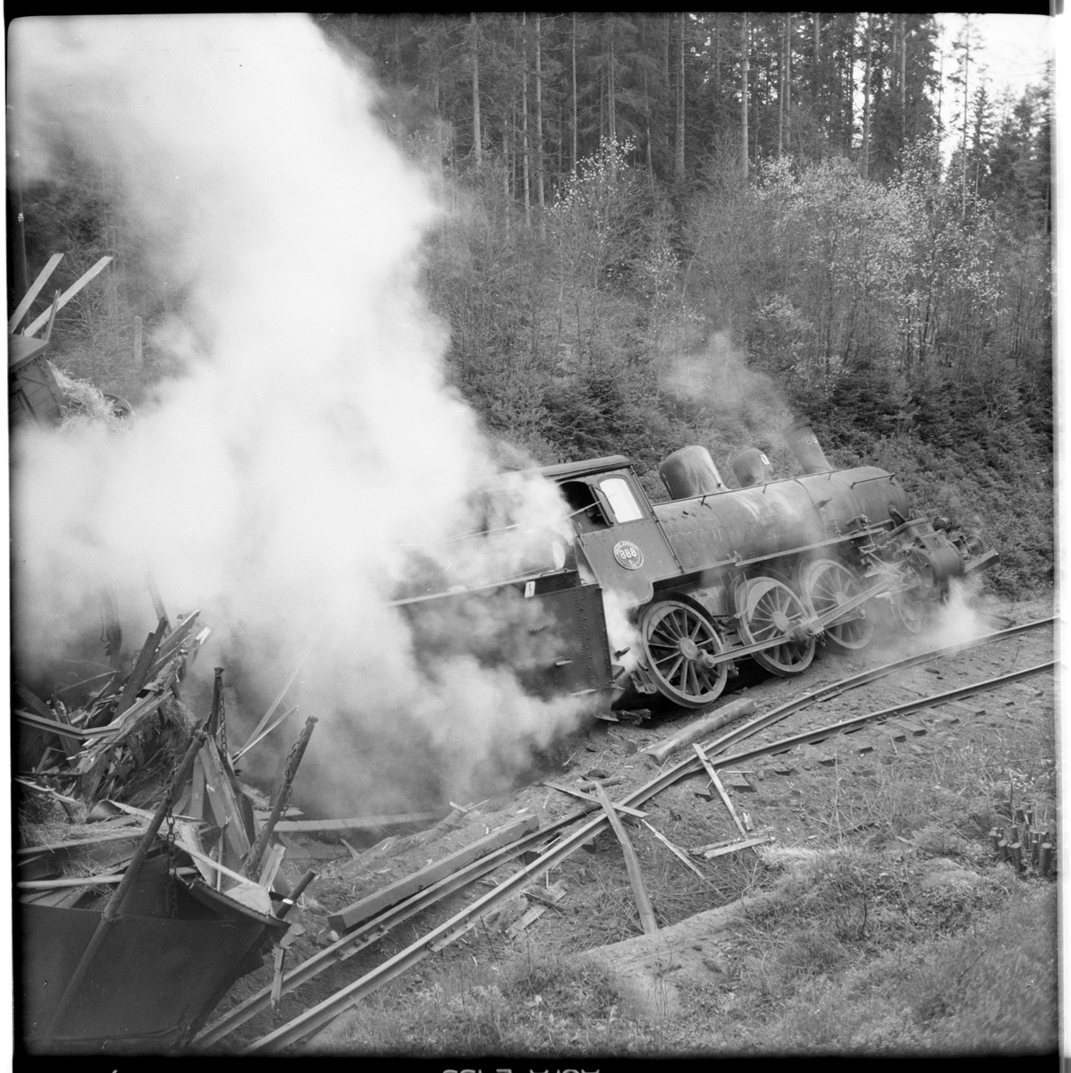 Statens Järnvägar, SJ B5 888 ligger på sidan efter urspårning.