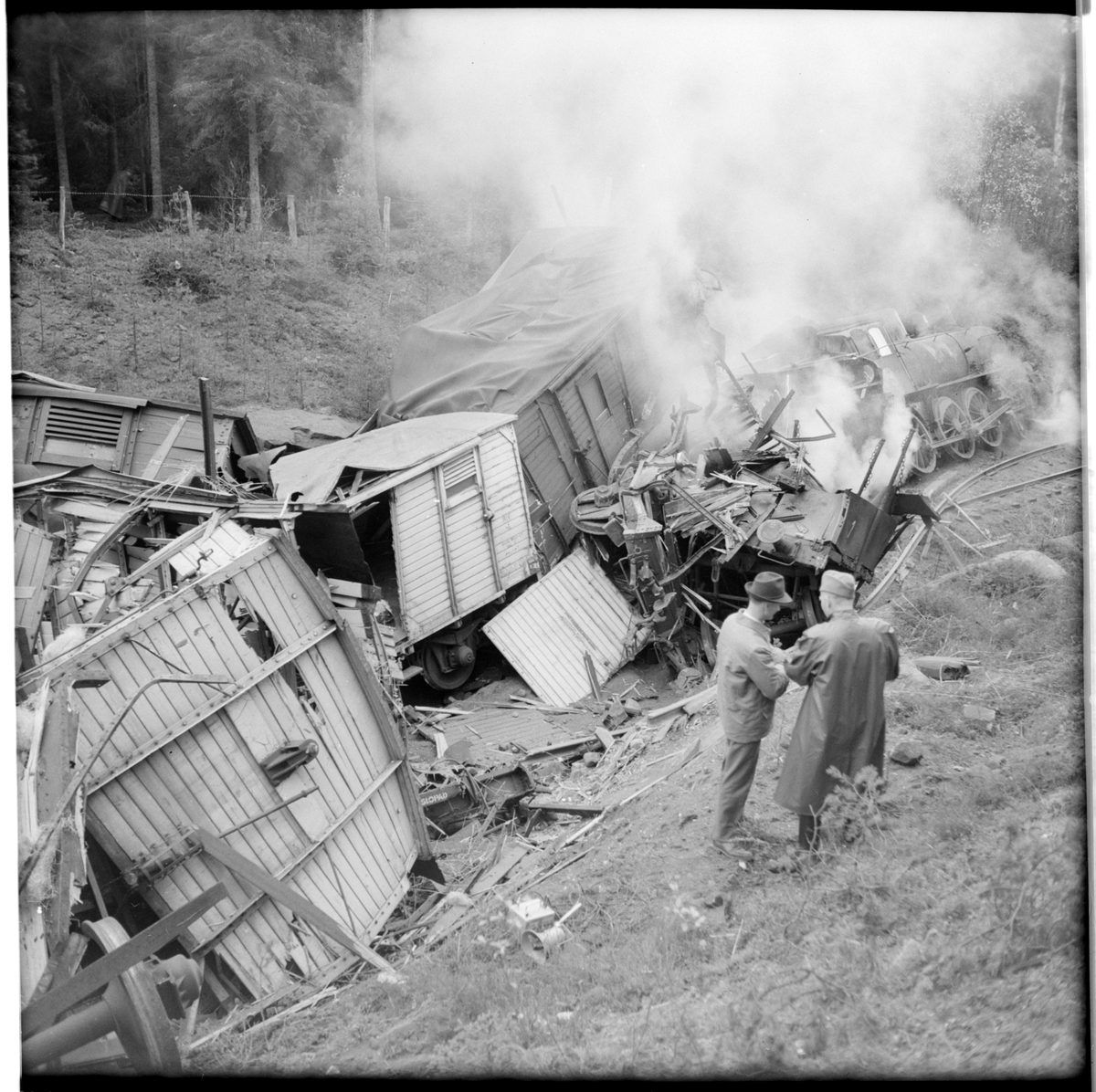 Statens Järnvägar, SJ B5 888 ligger på sidan av spåret. Godsvagnar i en hög av spillror.