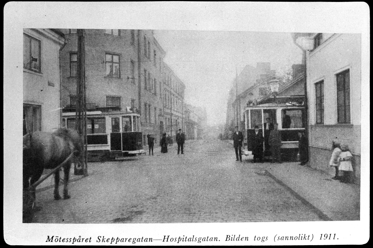 Norrköpings Kommunala Affärsverk, NKA spårvagnar på mötesspåret i korsningen Skepparegatan - Hospitalsgatan år 1911.
