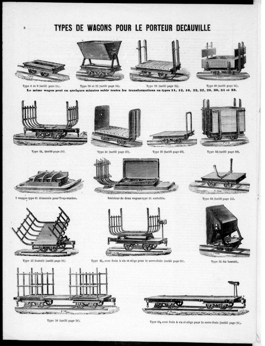 På bilden syns godsvagnar av lätt monterbara vagntyper för användning på Décauvillejärnväg. Décauvillejärnväg var ett system för lätt flyttbar smalspårjärnväg.