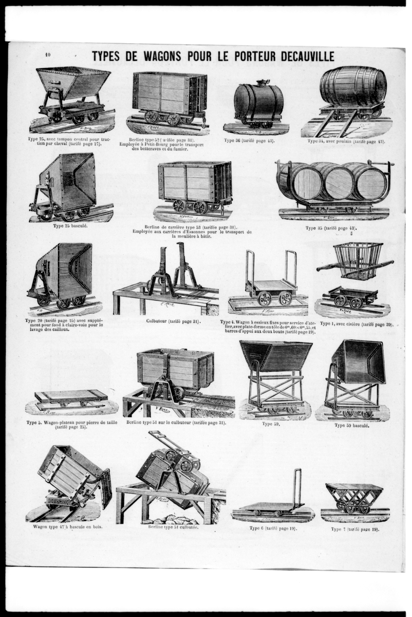På bilden syns tippvagnar av lätt monterbara vagntyper för användning på Décauvillejärnväg. Décauvillejärnväg var ett system för lätt flyttbar smalspårjärnväg.