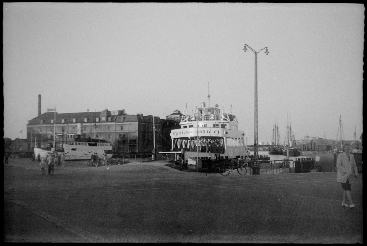 Färjan Kalmarsund IV ligger vid hamnen i Kalmar. Margarinfabriken till vänster i bild.