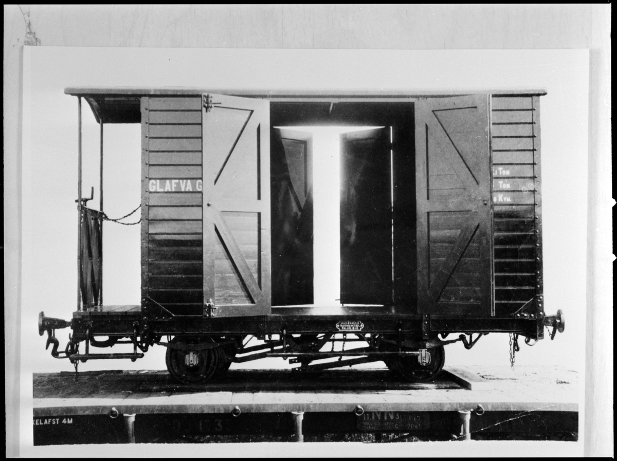 Glafva Glasbruk, godsvagn G lastad på vagn Gävle - Dala Järnväg, GDJ NN3 1733.