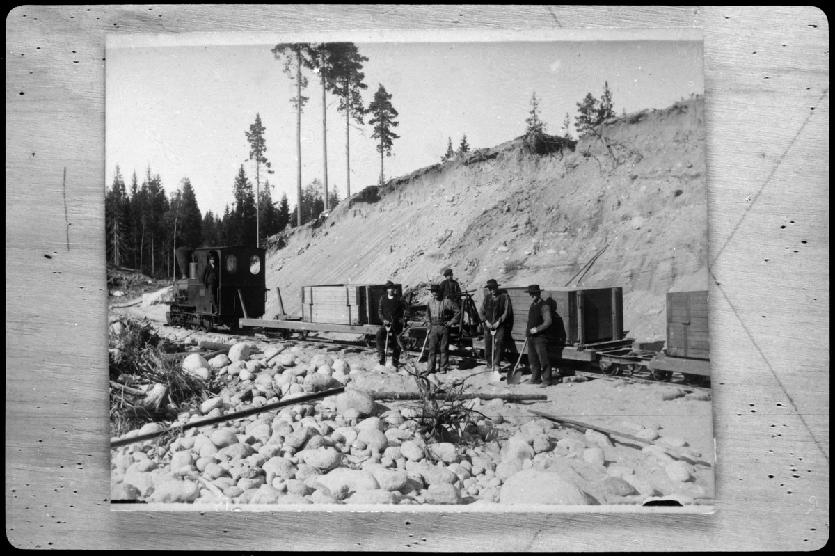 Ångtåg med lok 1 i Västeruds grusgrop. Fjädervagn lastad med grusskymme närmast loket och därefter provisoriska grusvagnar.