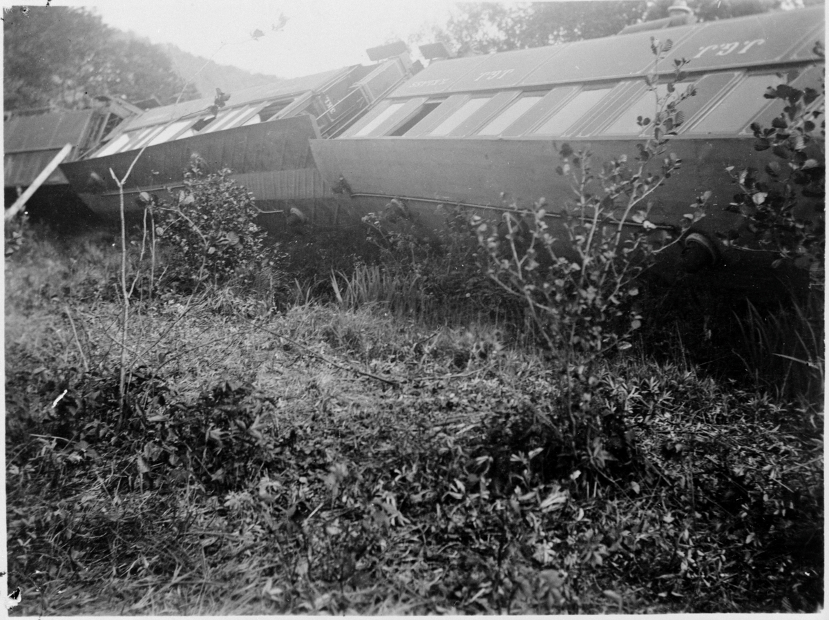 Järnvägsolycka vid Rosendala med tre personvagnar tillhörande Jönköping - Gripenbergs Järnväg, JGJ. 100 passagerare var ombord på tåget vid olyckstillfället, ingen blev dock skadad.