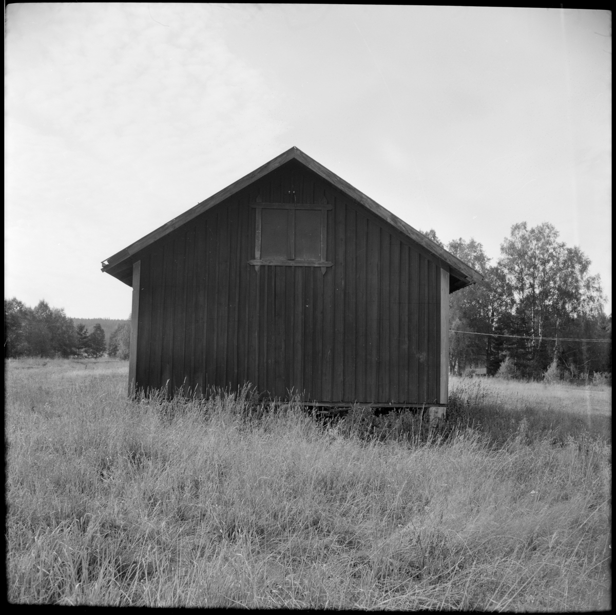 Vid utfarten av den nedlagda järnvägsstationen i Vireda ses gaveln på en husbyggnad.