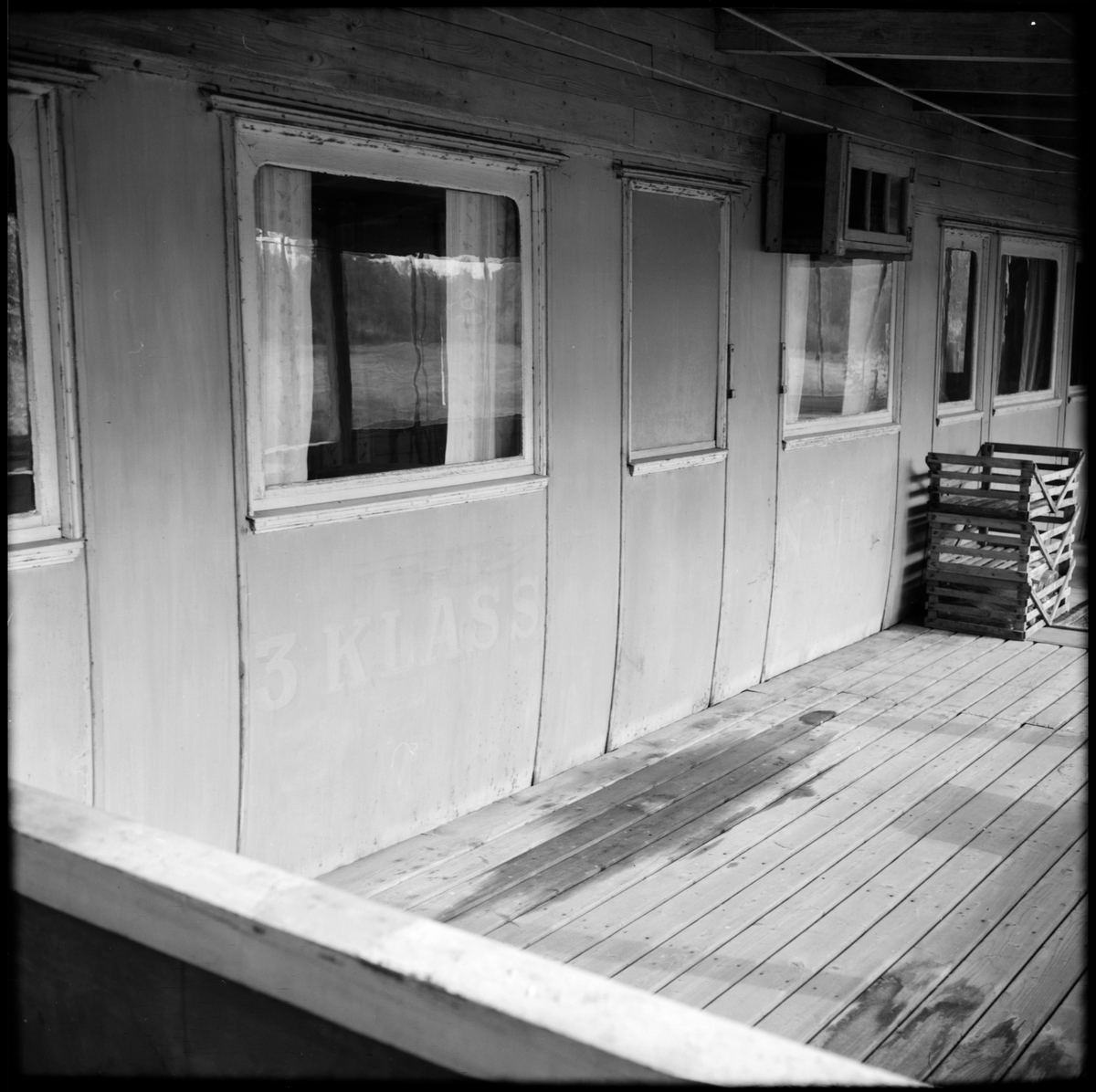 Personvagn ombyggd till en variant av bostad med altan.