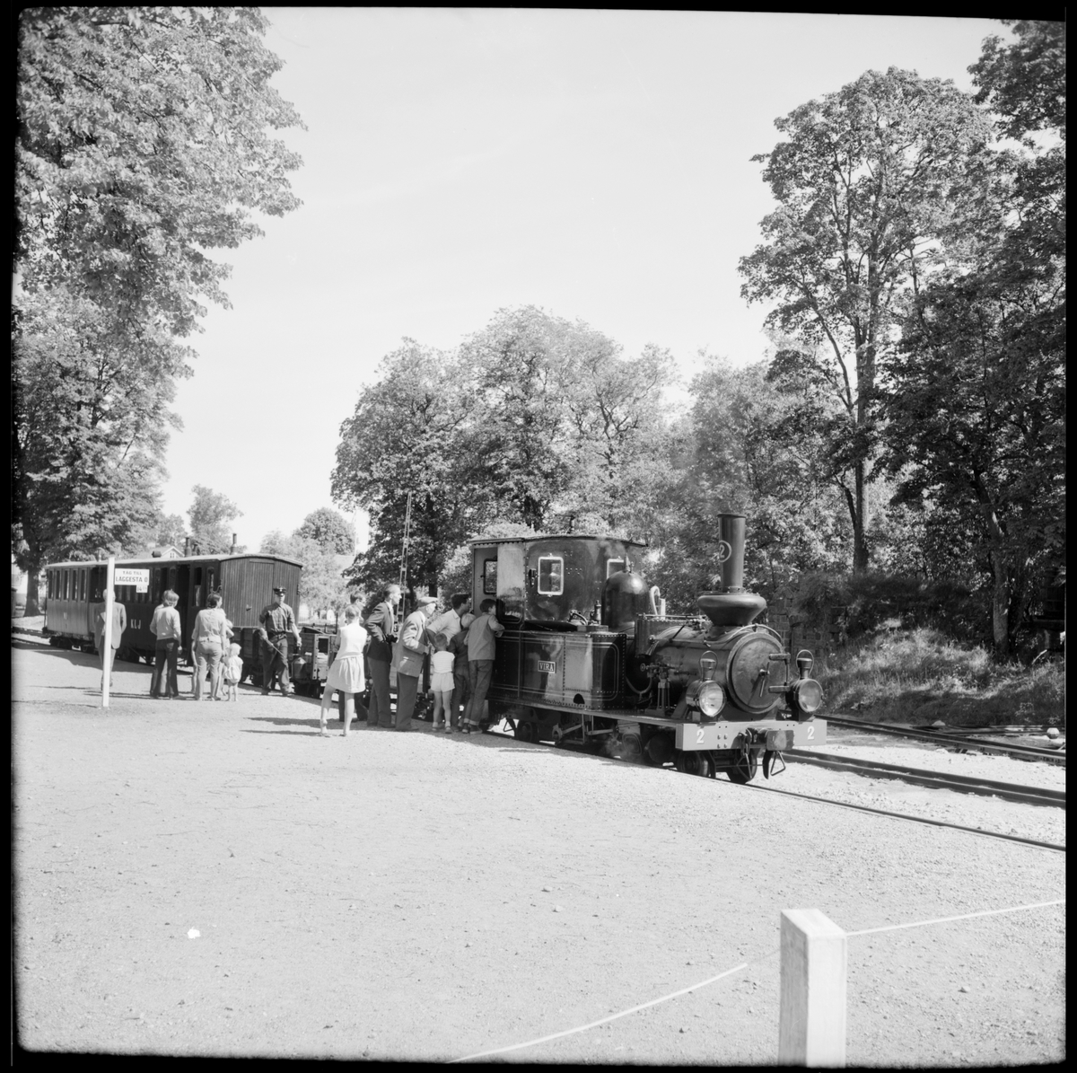Intresserade besökare kikar in i förarhytten på Östra Södermanlands Järnväg, ÖSlJ lok 2 "Virå" vid Mariefred station.