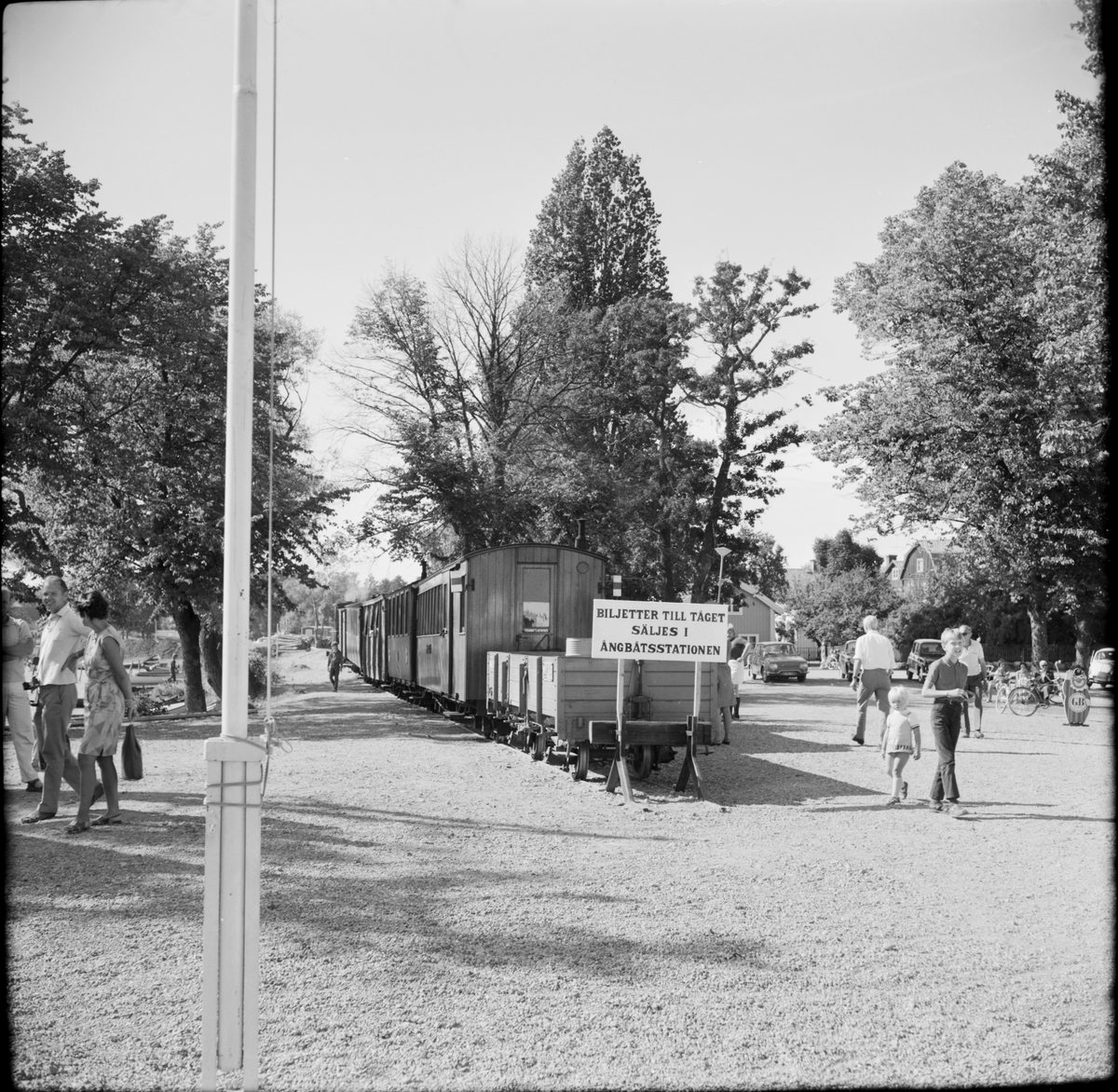 Museijärnvägen, Östra Södermanlands Järnväg, ÖSlJ ångtåg med resande vid hållplats på ångbåtsstationen i Mariefred.