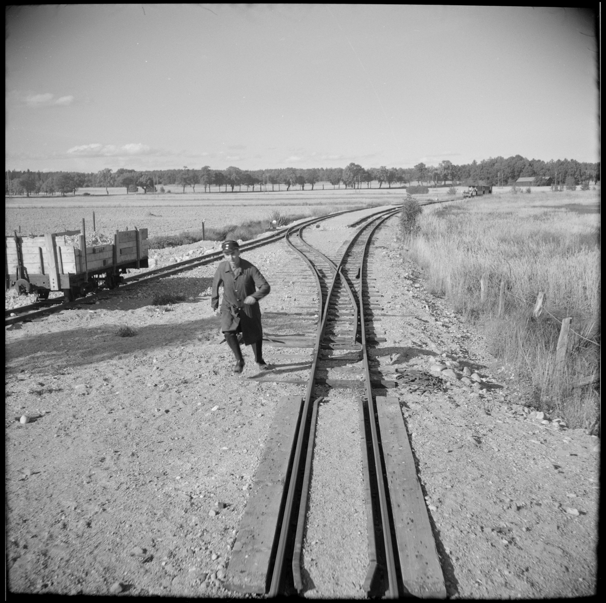 Personal försöker hinna ikapp avgående tåg på Museijärnvägen Östra Södermanlands Järnväg, ÖSlJ efter att ha lämnat en station.