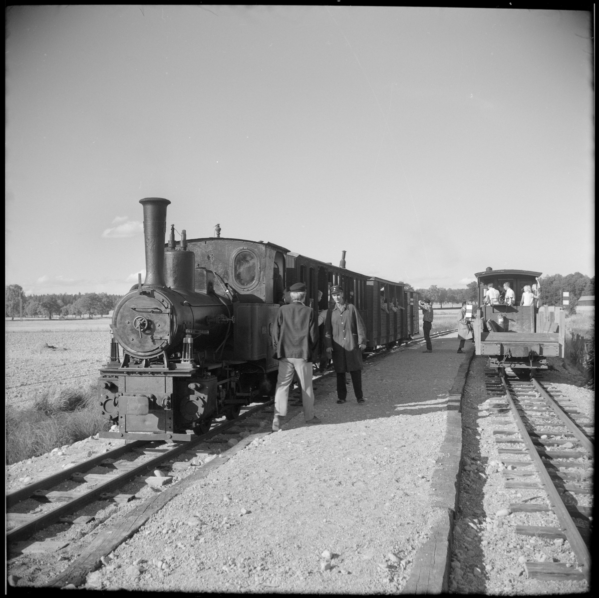 Museijärnvägen Östra Södermanlands Järnväg, ÖSlJ lok 3 "Dylta" med öppna personvagnar och tågmöte vid en station.