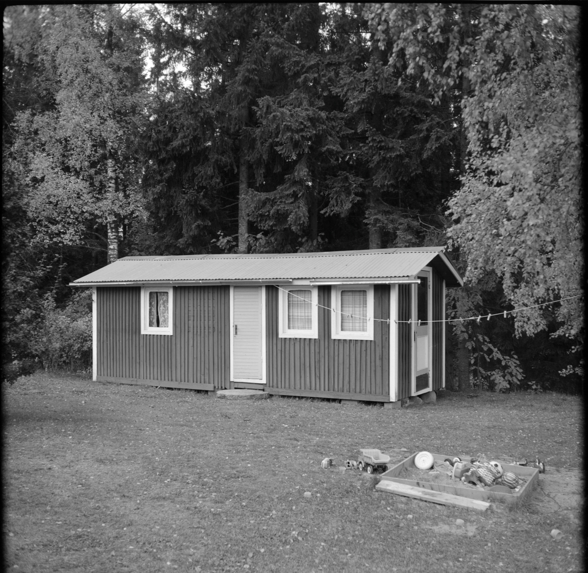 Husbyggnad med tvättlina och sandlåda till höger i bild.