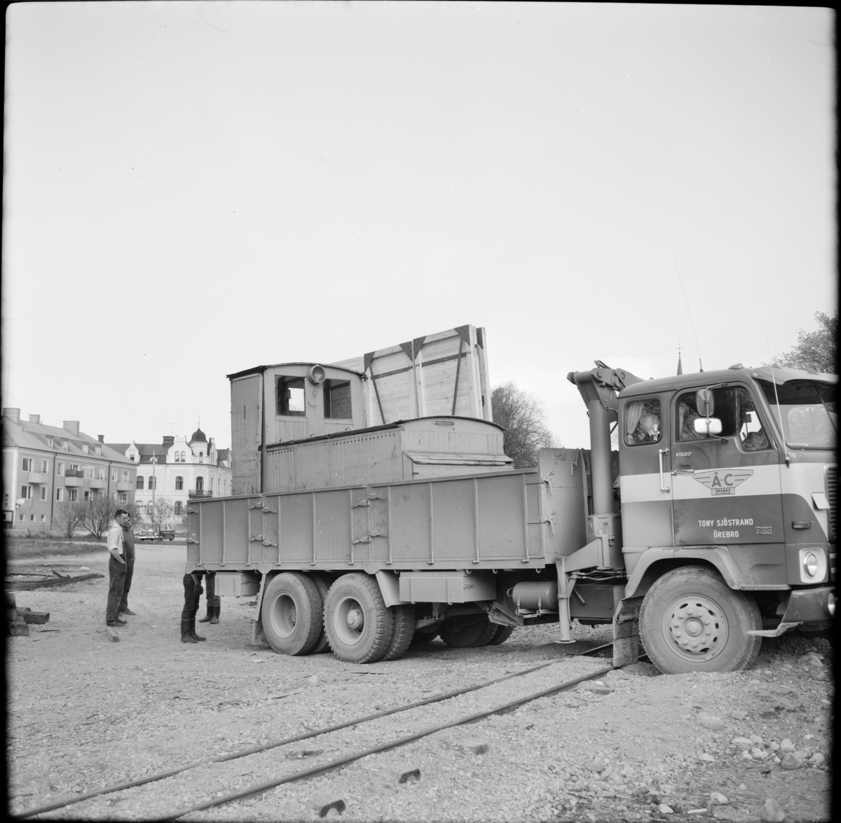 Museijärnvägen, Östra Södermanlands Järnväg, ÖSlJ ackumulatorlok 15 "Garpen" på lastbilsflaket vid bangården i Mariefred.