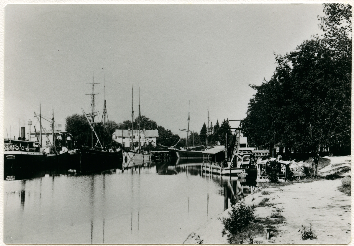 I bakgrunden till vänster skymtas Köping-Uttersberg Järnvägs gamla stationshus. Det vita huset i mitten av bilden var tidigare Köping Hult järnvägs restaurant och hotell, men det övertogs av Köping-Utterbergs järnväg 1886 och användes då som bostadshus åt trafikchefen.