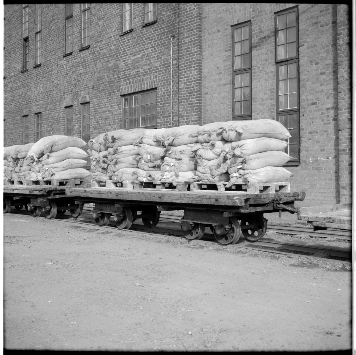 Säckar på brukets ofjädrade boggivagnar utanför pappersfabriken i Håverud.