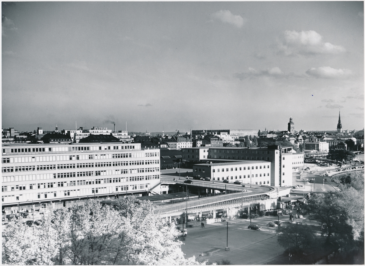 Stockholm central, vy mot SLT-Slottet vid Riddarholmen, Tyskakyrkan. Ilgodscentralen i Bangårdsposten i förgrunden.
