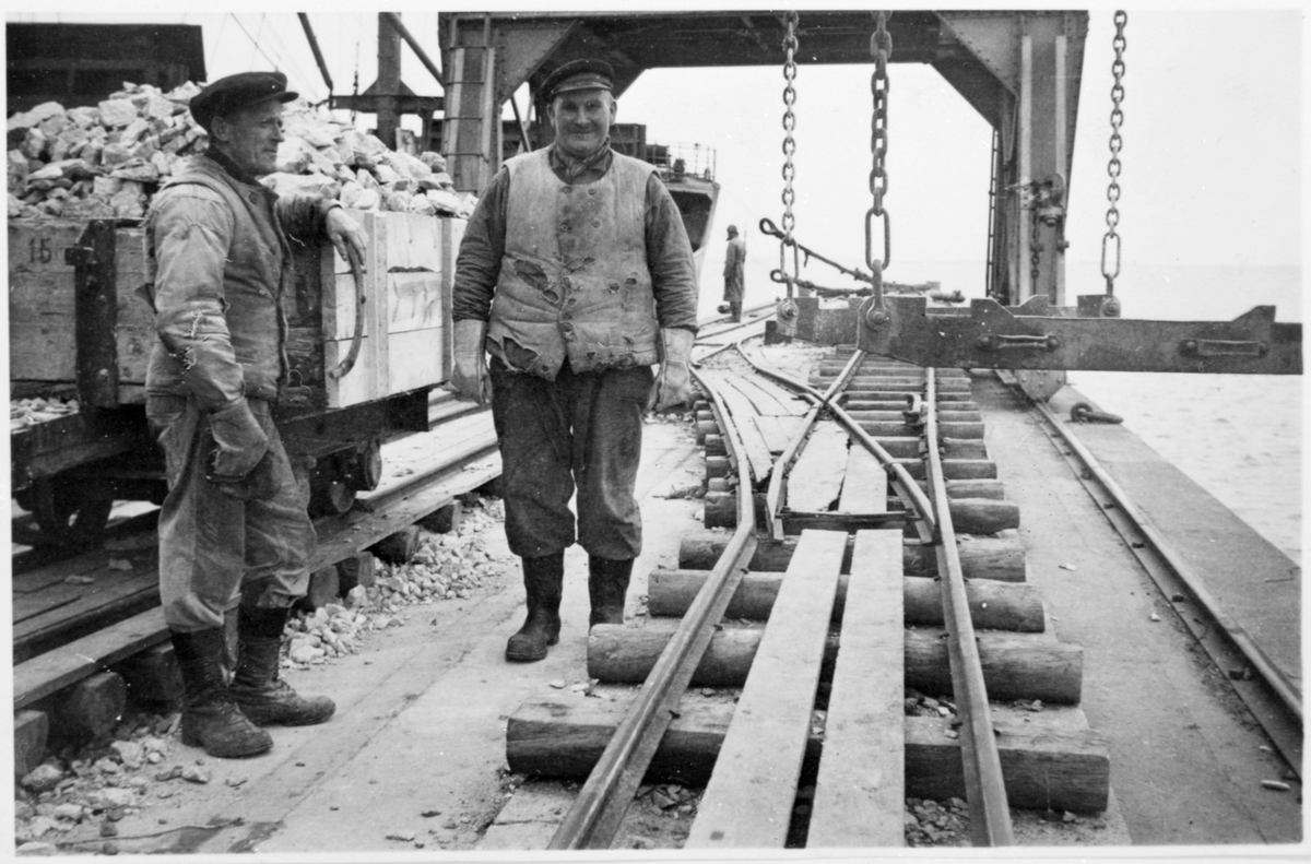 Två arbetare med fylld godsvagn i hamnen vid kalkbrottet Smöjen, Gotland.