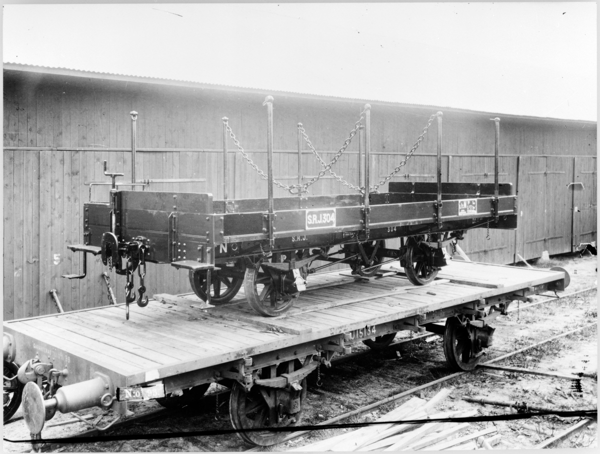 Smalspårig transportvagn från Stockholm Roslagens Järnvägar, SRJ N 304 på en normalspårig transportvagn Statens Järnvägar, SJ K 15134.