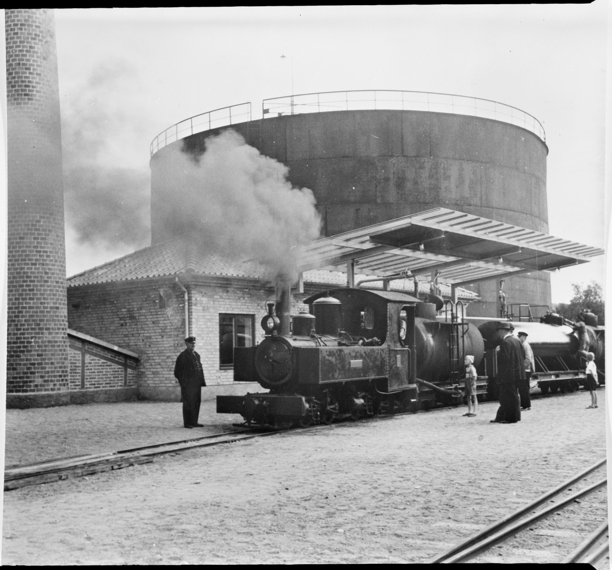 Munkedals Järnväg, MJ lok 6 "Munkedal" kopplad med tankvagn vid hamnen. Oljecistern ses bakom loket.