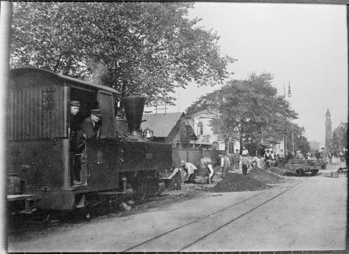 Grävning för stolpar inför elektrifieringen vid centralstationen. Helsingborg - Råå - Ramlösa Järnväg, HRRJ lok 1 har kört in vagnar med luftledningsstolpar.