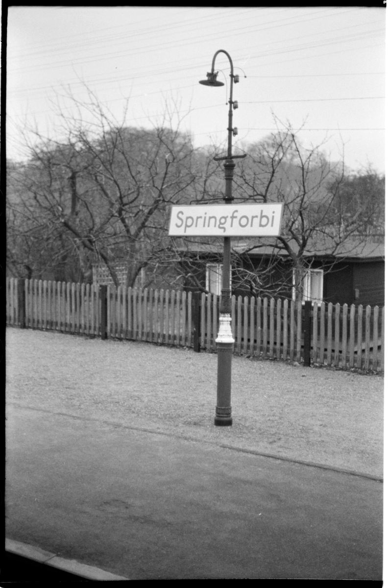 Stationsskylt vid plattformen på Springforbi station, Danmark.