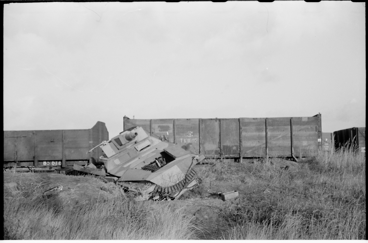 Resterna av en förstörd pansarvagn framför godsvagnar.