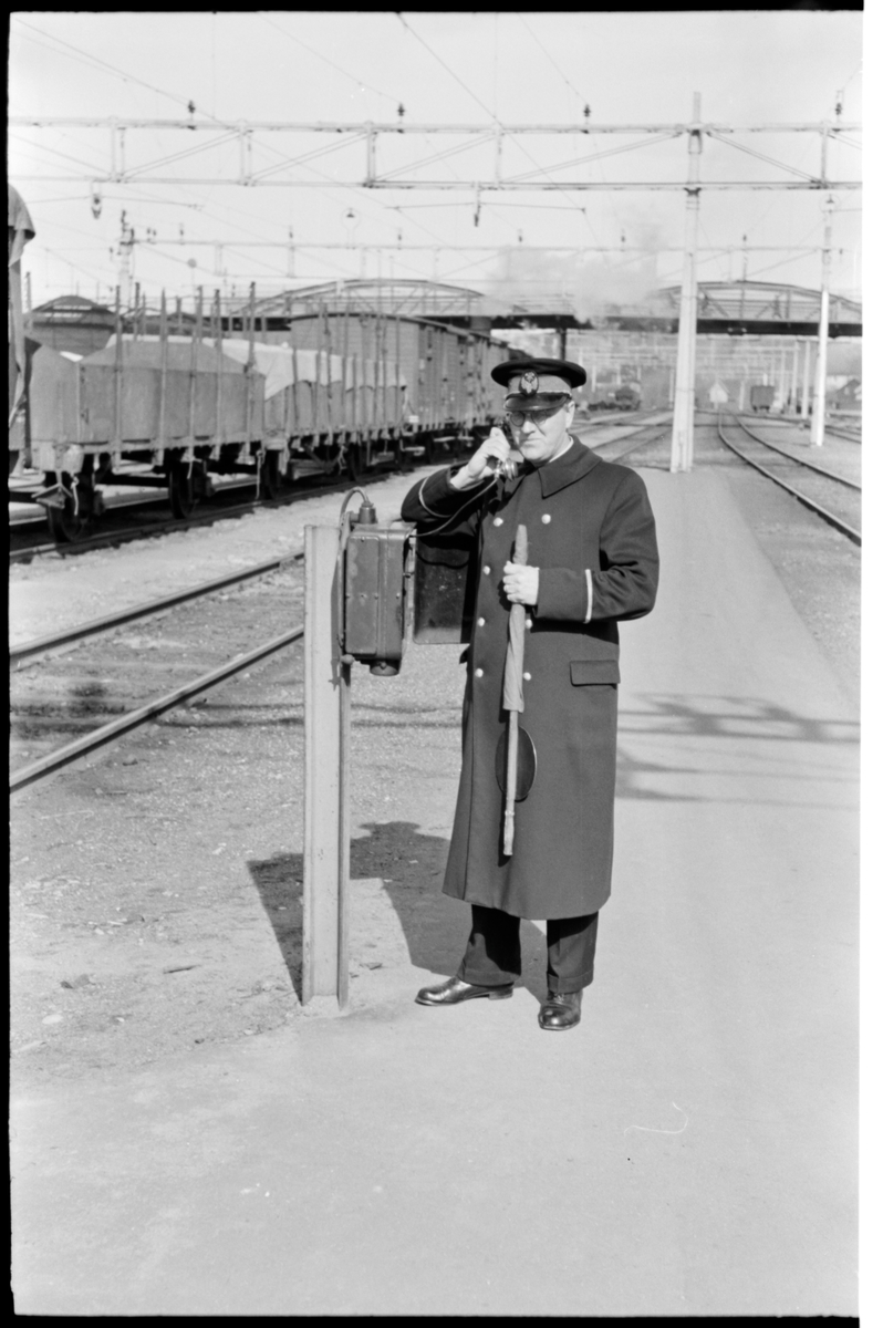 Järnvägspersonal med bangårdstelefon.