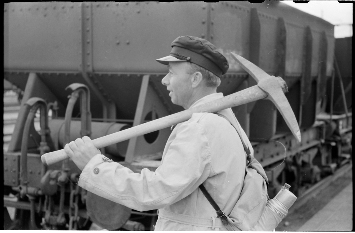 Man med korphacka vid bangård.