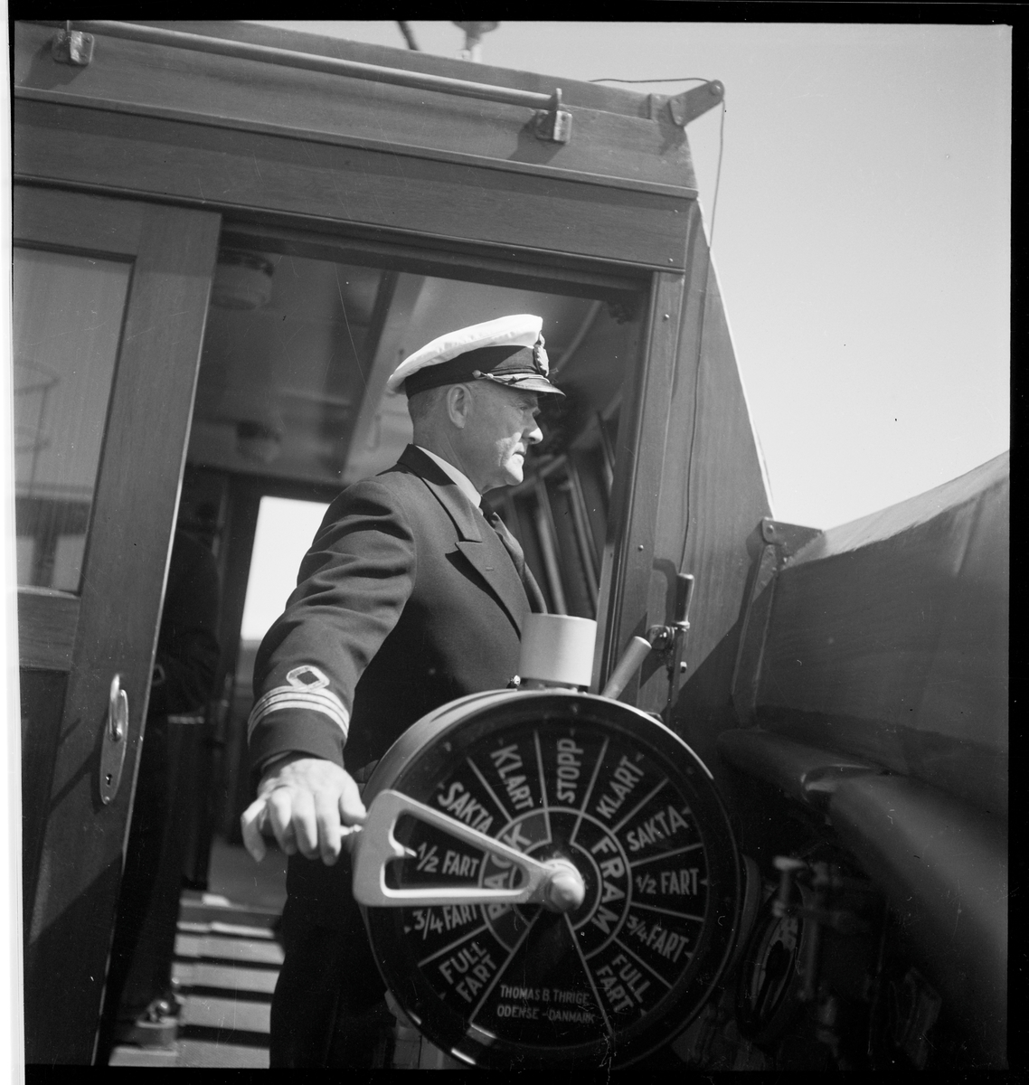Kapten i marinen vid fartygsrodret.