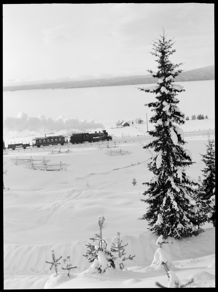 Statens Järnvägar, SJ E2 ånglok med godståg och personalvagn SJ C3g susar förbi i ett vinterlandskap.
