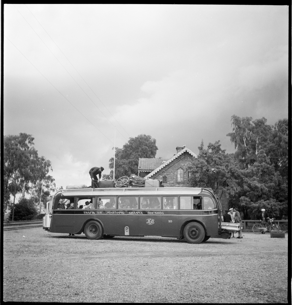 Gengasdrivenbuss. Lastning av bagage på busstaket.