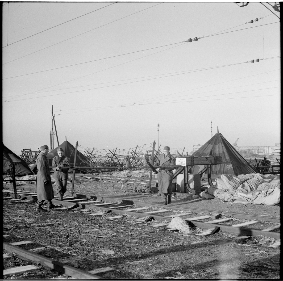 Personal vid SJ militärbyrå vid tyskt tältläger vid Trelleborg bangård.