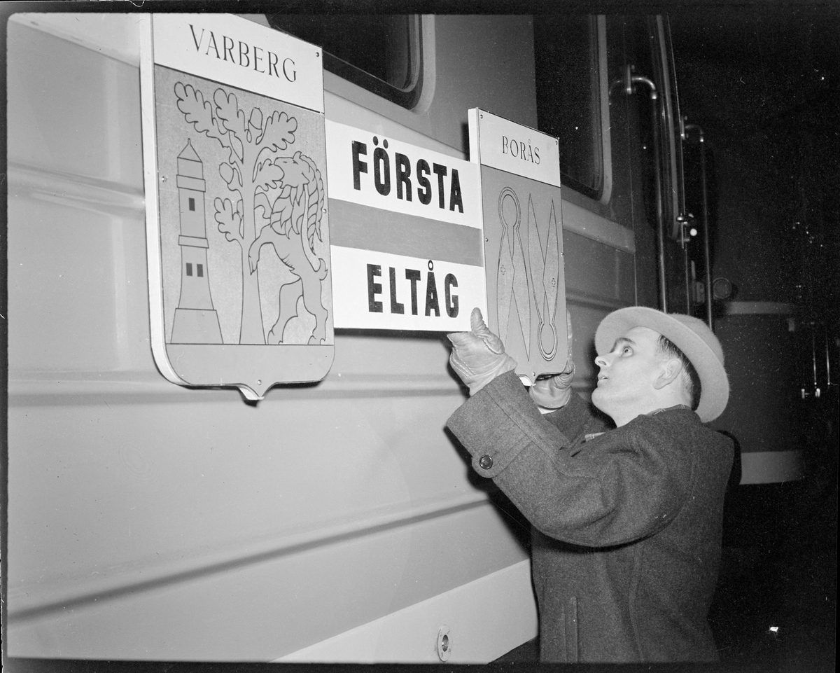 Arbete med skyltar på första eltåg på linjen mellan Varberg och Borås.
