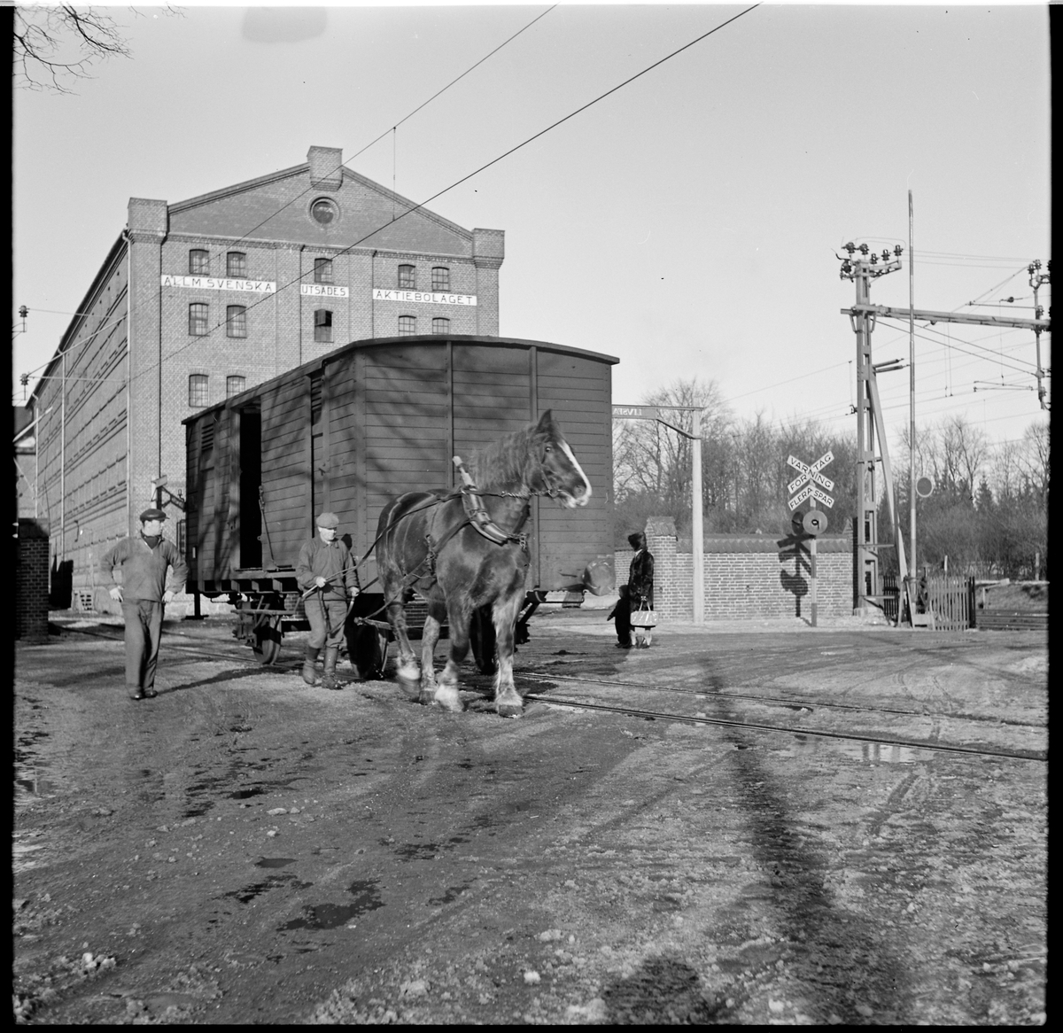 Arbetshäst drar godsvagn vid en järnvägsövergång.