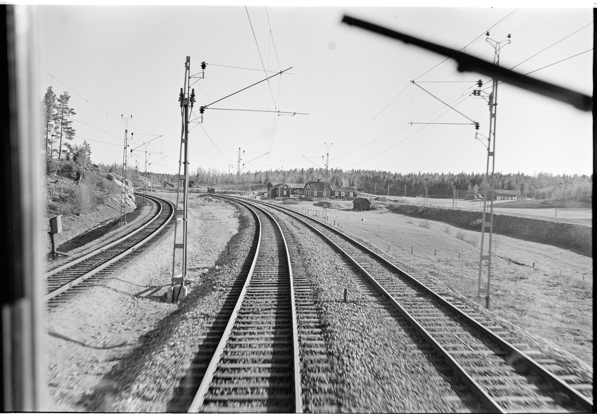 Vy över järnvägslinjen från förarhytt.