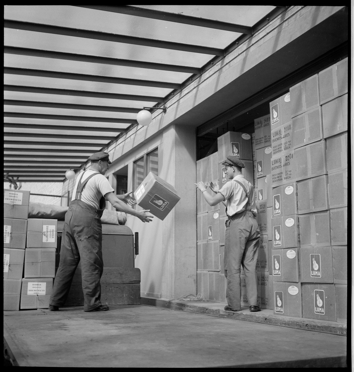 Män som hanterar gods av glödlampor. Kartongerna är märkta med destination Buenos Aires.